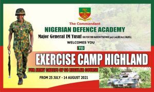 The Nigerian Defence Academy (NDA), says its final outdoor “Exercise Camp Highland’’ for 68 Regular Course Army Cadets will begin on Sunday.The Academy Public Relations Officer, Maj. Bashir Jajira, announced this in a statement on Friday in Kaduna.According to Jajira, the 21 days exercise which is expected to end on Aug. 14, will be conducted […]